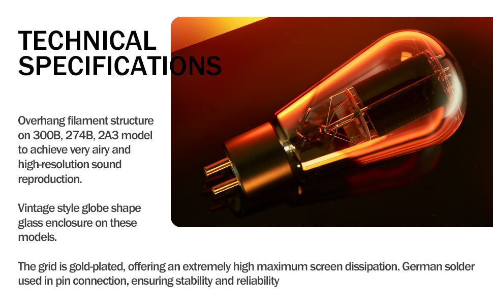 - Vintage style globe shape glass enclosure on tube amplifier of ACME 2A3 model. The grid is gold-plated, offering an extremely high maximum screen dissipation. German solder used in pin connection, ensuring stability and reliability.