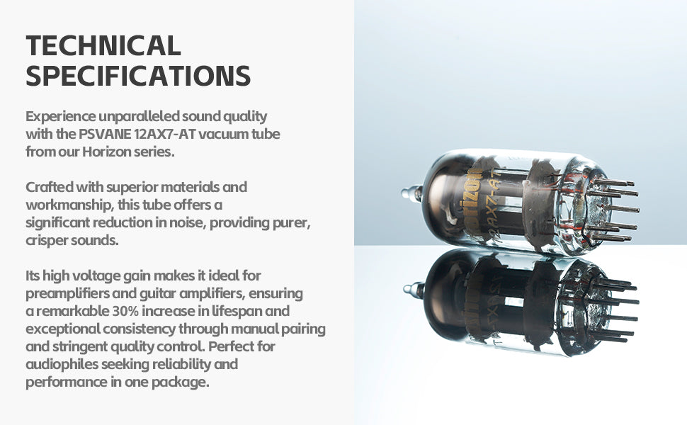 - Experience unparalleled sound quality with the PSVANE 12AX7-AT vacuum tube from our Horizon series. Crafted with superior materials and workmanship, this tube offers a significant reduction in noise, providing purer, crisper sounds. Its high voltage gain makes it ideal for preamplifiers and guitar amplifiers, ensuring a remarkable 30% increase in lifespan and exceptional consistency through manual pairing and stringent quality control. Perfect for audiophiles seeking reliability and performance in one package.