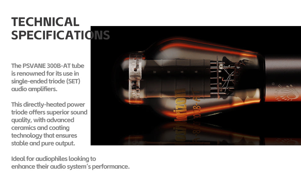 - The PSVANE 300B-AT stands out with its special shaped balloon glass envelope, engineered to improve thermal dissipation, and maintain a superior vacuum for enhanced sound quality. This beam power tetrode delivers powerful, tube-untypical bass, making it an outstanding choice for audiophiles and professional users alike. With advanced ceramics and anode technology, this tube offers a significant boost in power and stability, perfect for demanding audio applications.