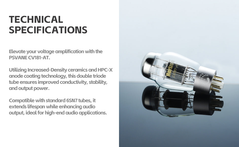 - CV181-AT in the PSVANE Horizon series use Increased-Density ceramics for the base to improve on low conductivity and stability. And due to the HPC-X anode coating technology, anode-power's improved, thereby increasing output power, it can also absorb excess gas, extending life span. It is double triode, used in voltage amplification circuit and it can be replaceed directly by standard 6SN7 tubes.