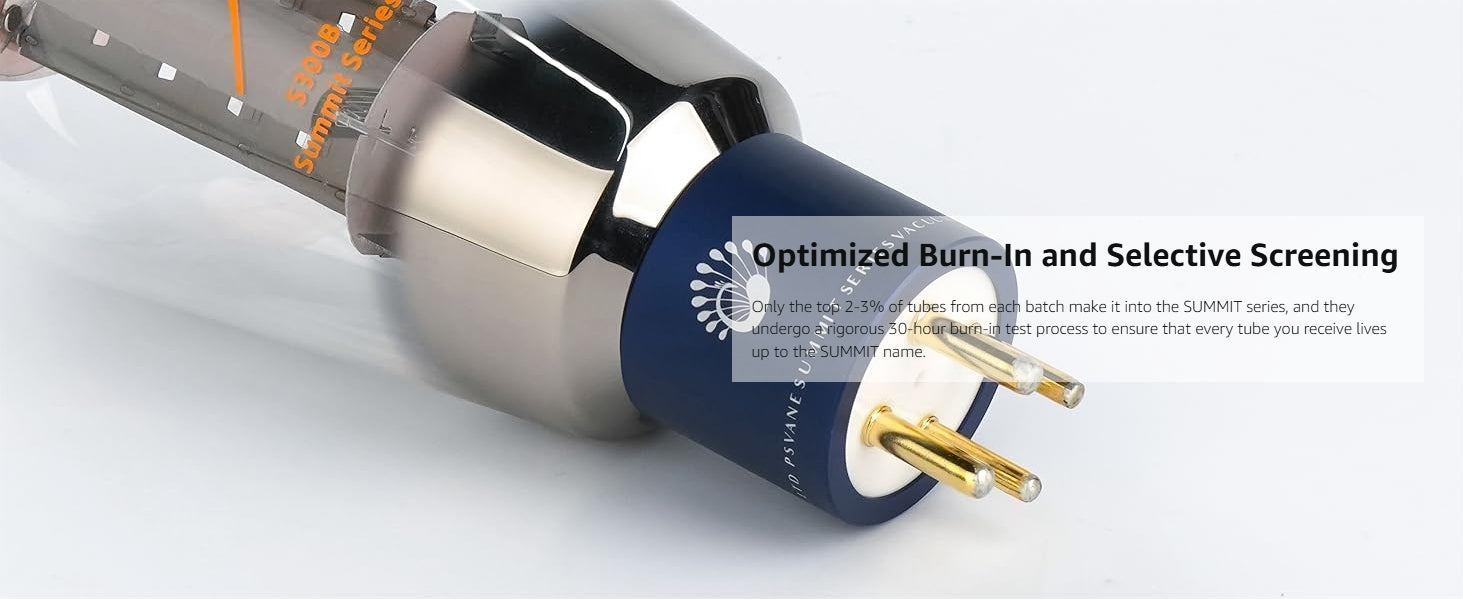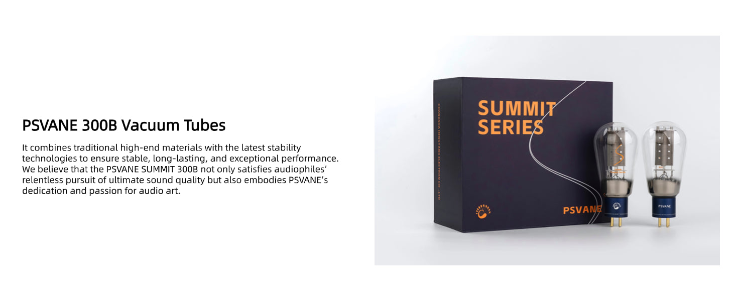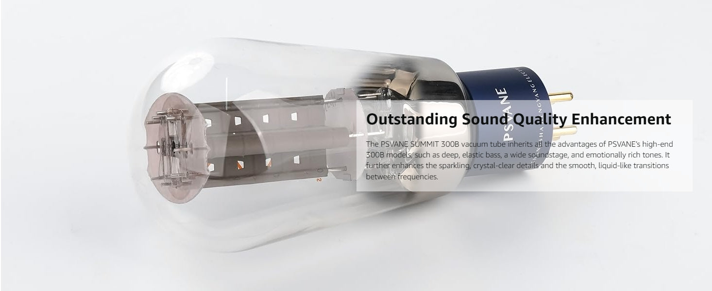 - The PSVANE SUMMIT 300B vacuum tube inherits all the advantages of PSVANE’s high-end 300B models, such as deep, elastic bass, a wide soundstage, and emotionally rich tones. It further enhances the sparkling, crystal-clear details and the smooth, liquid-like transitions between frequencies. The result is a perfect blend of warmth, richness, sweetness, and transparency, providing audiophiles with a truly mesmerizing auditory experience.